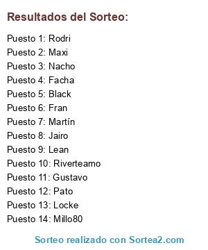 Lista de participantes: Facha, Fran, Gustavo, Black, Lean, Locke, Martín, Millo80, Nacho, Pato, Maxi, Riverteamo, Rodri, Jairo.