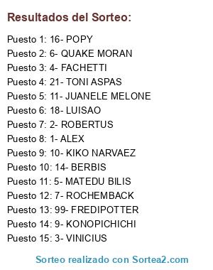 Lista de participantes: 1- ALEX, 2- ROBERTUS, 3- VINICIUS, 4- FACHETTI, 5- MATEDU BILIS, 6- QUAKE MORAN, 7- ROCHEMBACK, 9- KONOPICHICHI, 10- KIKO NARVAEZ, 11- JUANELE MELONE, 14- BERBIS, 16- POPY, 18- LUISAO, 21- TONI ASPAS, 99- FREDIPOTTER.