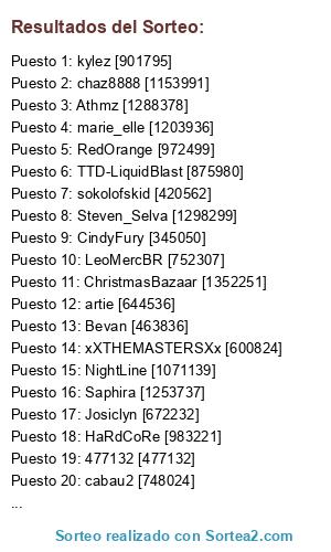 Lista de participantes: artie [644536], Paige [194889], marie_elle [1203936], CindyFury [345050], ChristmasBazaar [1352251], rtsk13 [698278], Bevan [463836], Buttonz [1421926], cabau2 [748024], chaz8888 [1153991], staticman [893424], LeoMercBR [752307], IronHide [1281059], 477132 [477132], johnjt [886430], landermate [561149], kylez [901795], Josiclyn [672232], Navin [786973], Athmz [1288378], xXTHEMASTERSXx [600824], Steven_Selva [1298299], NightLine [1071139], RedOrange [972499], HaRdCoRe [983221], Saphira [1253737], TTD-LiquidBlast [875980], sokolofskid [420562], D_E_M_O_N [1515370].