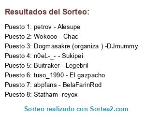 Lista de participantes: Wokooo - Chac, petrov - Alesupe, abpfans - BelaFarinRod, Dogmasakre (organiza ) -DJmummy, n0eL-_- - Sukipei, tuso_1990 - El gazpacho, Buitraker - Legebril, Statham- reyox.