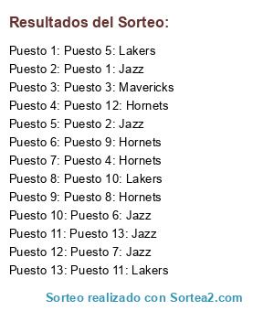 Lista de participantes: Puesto 1: Jazz, Puesto 2: Jazz, Puesto 3: Mavericks, Puesto 4: Hornets, Puesto 5: Lakers, Puesto 6: Jazz, Puesto 7: Jazz, Puesto 8: Hornets, Puesto 9: Hornets, Puesto 10: Lakers, Puesto 11: Lakers, Puesto 12: Hornets, Puesto 13: Jazz.