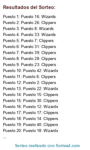 Lista de participantes: Puesto 1: Clippers, Puesto 2: Clippers, Puesto 3: Clippers, Puesto 4: Wizards, Puesto 5: Clippers, Puesto 6: Clippers, Puesto 7: Clippers, Puesto 8: Wizards, Puesto 9: Wizards, Puesto 10: Wizards, Puesto 11: Clippers, Puesto 12: Wizards, Puesto 13: Clippers, Puesto 14: Clippers, Puesto 15: Clippers, Puesto 16: Wizards, Puesto 17: Clippers, Puesto 18: Wizards, Puesto 19: Wizards, Puesto 20: Wizards, Puesto 21: Wizards, Puesto 22: Wizards, Puesto 23: Clippers, Puesto 24: Wizards, Puesto 25: Clippers, Puesto 26: Clippers, Puesto 27: Wizards, Puesto 28: Clippers, Puesto 29: Clippers, Puesto 30: Clippers, Puesto 31: Clippers, Puesto 32: Clippers, Puesto 33: Wizards, Puesto 34: Clippers, Puesto 35: Clippers, Puesto 36: Clippers, Puesto 37: Clippers, Puesto 38: Wizards, Puesto 39: Clippers, Puesto 40: Clippers, Puesto 41: Clippers, Puesto 42: Wizards.
