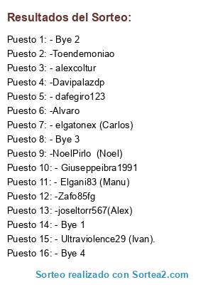 Lista de participantes: -NoelPirlo (Noel), - alexcoltur, -Toendemoniao, -Davipalazdp, - dafegiro123, - elgatonex (Carlos), - Ultraviolence29 (Ivan)., -Zafo85fg, -joseltorr567(Alex), - Giuseppeibra1991, - Elgani83 (Manu), -Alvaro, - Bye 1, - Bye 2, - Bye 3, - Bye 4.