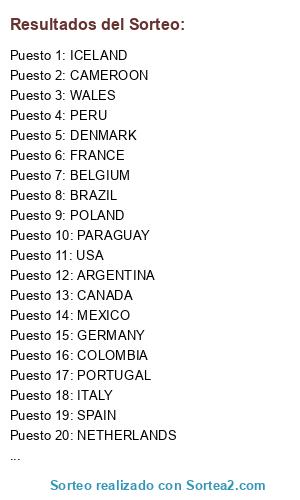 Lista de participantes: ITALY, PERU, CHILE, PARAGUAY, URUGUAY, MEXICO, IVORY COAST, BRAZIL, NETHERLANDS, ARGENTINA, COLOMBIA, WALES, ICELAND, PORTUGAL, ENGLAND, POLAND, FRANCE, USA, CANADA, BELGIUM, DENMARK, SPAIN, GERMANY, CAMEROON.