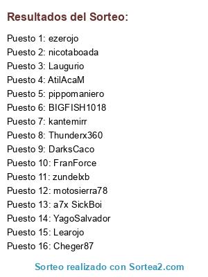 Lista de participantes: zundelxb, motosierra78, Laugurio, YagoSalvador, BIGFISH1018, Learojo, ezerojo, kantemirr, AtilAcaM, Thunderx360, pippomaniero, FranForce, a7x SickBoi, DarksCaco, nicotaboada, Cheger87.