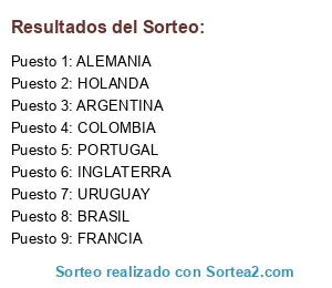 Lista de participantes: INGLATERRA, FRANCIA, PORTUGAL, HOLANDA, URUGUAY, ARGENTINA, BRASIL, COLOMBIA, ALEMANIA.