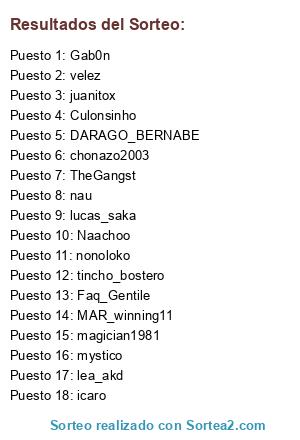 Lista de participantes: nau, velez, Culonsinho, MAR_winning11, nonoloko, juanitox, Faq_Gentile, Gab0n, chonazo2003, tincho_bostero, lucas_saka, icaro, lea_akd, mystico, magician1981, TheGangst, DARAGO_BERNABE, Naachoo.
