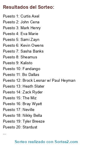 Lista de participantes: Seth Rollins, Roman Reigns, Brock Lesnar w/ Paul Heyman, John Cena, Randy Orton, Finn Bálor, Cesaro, Sami Zayn, Dean Ambrose, The New Day, Wade Barrett, Sheamus, Bray Wyatt, Chris Jericho, Rusev and Lana, The Miz, Kevin Owens, Sasha Banks, Baron Corbin, Enzo and Big Cass, Dolph Ziggler, Kalisto, Sin Cara, Tyson Kidd, Kane, Big Show, Neville, Natalya, Paige, R-Truth, Goldust, Stardust, The Usos, The Prime Time Players, Naomi, Jack Swagger, The Ascension, Zack Ryder, Mark Henry, Tyler Breeze, Fandango, Bo Dallas, Eva Marie, Curtis Axel, Erick Rowan, Alicia Fox, Brie Bella, Nikky Bella, Luke Harper, Triple h, Undertaker, Heath Slater, Adam Rose.