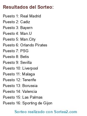 Lista de participantes: Real Madrid, Sporting de Gijon, Las Palmas, Malaga, Betis, Valencia, Sevilla, Tenerife, Cadiz, PSG, Man.U, Man.City, Liverpool, Bayern, Borussia, Orlando Pirates.