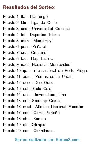 Lista de participantes: tac = Dep_Tachira, nac = Nacional_Montevideo, cru = Cruzeiro, ldu = Liga_de_Quito, dep = Dep_Quito, cor = Corinthians, ipa = Internacional_de_Porto_Alegre, oli = Olimpia, cer = Cerro_Porteño, col = Colo_Colo, uca = Universidad_Catolica, sto = Santos, fla = Flamengo, unl = Universitario_Lima, cri = Sporting_Cristal, med = Atletico_Nacional_Medellin, tol = Deportes_Tolima, mon = Monterrey, pum = Pumas_de_la_Unam, pen = Peñarol.