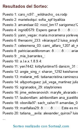 Lista de participantes: _mariajesus4: , _mia_barrantes_:, a.l.e.x.1.8.9.4: , acastillo_04: , allyportuguez: juli_vega_martinez julian_fz_, amandaar.02: nicol_bm17 sarigomez12, ana.lucia26: cristina_anacona pamelaveneg, andre.3024: raque.zuniga kris_lunanava, andrea.vega.96742: stephsan_17 gabyma5, angie_sing_r: sharon_1292 keisharvey, are_pricer: kim.ramirez.12 greivinfuertes, arelyvegacr: dasaborio28 daka_23.09, arlyn_artavia: raquepr96 yor_sl12, belquizvillalobosrodriguez: nicol_lemakeup 😍😍, bloommk94: andre45ma elizaaraya 😍😍, caro_rc97: _wildnacho_ os.rodp, celesmena_03: cami_alfaro_1207 ali_molina69nay.lea06, danielademie: marymata2212 dianagobren, daya_bonillag: julian_lb angelit0.07, diiana_m94: andrezamora01 kari1898_ 🤩, fa_porras: paoespinoza29 stacey26g, fabi_perez_rio: ___a_s_t_r_i_d__ stwar_munoz marionxadani fiorela._poblete_ jennifer_agb, francinie_arce_p: _daniel_arce_ arce6805, gene_conejo20: anconejo chavesaguilaroscar17 ❤️, ingrid0579: Espero ganar 😂😂, jime_estevanovich: maryfe_alvarado cristina___leon, joss.chaconn: kriss.lmm natalia__mc, karyna983: nati.castillo20 prisi0515, laubonillam: adribonillam ana_jcastillo, lilymonteromora: marcelamonteromora adrianahernandez2234 😍, luisa_aray5: _mariajesus4 gabriela.sandovals, mackenlye: dayana_1413 hazelaldecoba, magaly976: betty.acuna.982 maribonilla022 nelabonillau, maria_arrieta_01: fer.arrieta97 maritza.leiva.3114, mariajose_1130: x_lela_finsta naoo_finstax, maribonilla022: _kristel_cas nyaaah1289, marielsolqui: sofia_spf byalitza, marifallas29: 😍😍 Este es mi mes, por lo tanto debo ganar esto karol.correa06 nic_cp07, marije_vargas: pauvargas64 sil_vargas_ j9920ksj, mauboniilla: _aliblanco brenda__daniela__, mejupe15: Bellisimo alejagb_25 maribonilla022, mel_ferbar: sebasreyna rey_calderon07 reychell_arcem kim_bowens, melanie_m6: tatianacristina.ramirezcamacho celesmena_03, moni_cespedes40: aa_ron5312 nyhoxiwnl, naye_var_leo08: heredera_del_sabor vargas_fotografia, nicol_lemakeup: belquizvillalobosrodriguez niko_alva_23, obonilla97: sach_calvo11 amandas_0421, pao.solano27: marielsolqui solanosofy, paovmcc: valecamacho124 marianna.solano, patriciacastilloroman: 😍😍ariannacerdas yo_soy_mariajo, sgranados_29: staybriones, sil_lr: sorsaritav78 ada.velasquez.14606, sol_fio_24: vargas_priv02 gracias, tatiana__avila: alexander_quiros7 luis11lleon, thenaomi_233: vikiaraya12 luisa_aray5, vale_g.14: renteria4704 dyna_qv17 💗, vargas_priv02: sol_fio_24 Suerte ❤️, vikiaraya12: thenaomi_233 juliia1203, vrg99a: esteban_avila2002 alonsoavila9771, wendy.lezcano.98: cristinaflores7214 grettel_lez, wilson_as7: ximena_13rm, xabixpjmx: amy_mora11 marypaula_fb, yann_vegav: maria.moramena yorlevega2019, yen7442: kirbyfuntime15 danicm_31 ❤️.