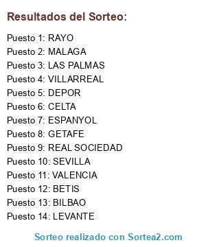 Lista de participantes: VALENCIA, VILLARREAL, SEVILLA, REAL SOCIEDAD, BETIS, ESPANYOL, DEPOR, CELTA, RAYO, MALAGA, GETAFE, BILBAO, LEVANTE, LAS PALMAS.