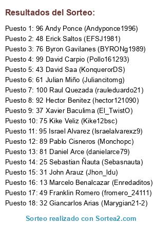 Lista de participantes: 49 Franklin Romero (fromero_24111), 43 David Saa (KonquerorDS), 76 Byron Gavilanes (BYRONg1989), 81 Daniel Arce (danielarce79), 75 Kike Veliz (Kike12bsc), 95 Israel Alvarez (Israelalvarexz9), 100 Raul Quezada (rauleduardo21), 96 Andy Ponce (Andyponce1996), 99 David Carpio (Pollo161293), 48 Erick Saltos (EFSJ1981), 13 Marcelo Benalcazar (Enredaditos), 61 Julian Miño (Juliancitomg), 92 Hector Benitez (hector121090), 25 Sebastian Ñauta (Sebasnauta), 37 Xavier Baculima (El_TwistO), 31 John Arauz (Jhon_ldu), 89 Pablo Cisneros (Monchopc), 32 Giancarlos Arias (Marygian21-2).