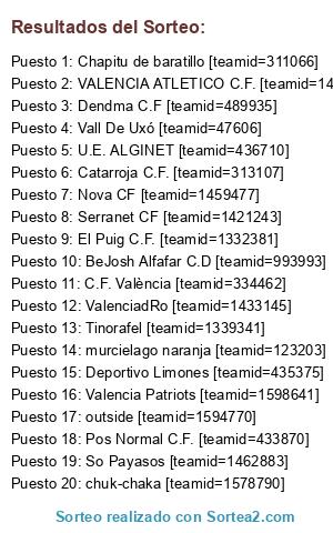 Lista de participantes: Chapitu de baratillo [teamid=311066], BeJosh Alfafar C.D [teamid=993993], Dendma C.F [teamid=489935], Pos Normal C.F. [teamid=433870], So Payasos [teamid=1462883], Tinorafel [teamid=1339341], Vall De Uxó [teamid=47606], Catarroja C.F. [teamid=313107], Serranet CF [teamid=1421243], Nova CF [teamid=1459477], VALENCIA ATLETICO C.F. [teamid=1458069], C.F. València [teamid=334462], murcielago naranja [teamid=123203], chuk-chaka [teamid=1578790], outside [teamid=1594770], El Puig C.F. [teamid=1332381], ValenciadRo [teamid=1433145], Valencia Patriots [teamid=1598641], Deportivo Limones [teamid=435375], U.E. ALGINET [teamid=436710].