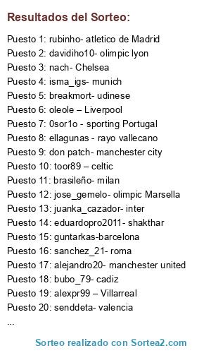 Lista de participantes: admin-juventus, guntarkas-barcelona, pedrito-oporto, davidiho10- olimpic lyon, rubinho- atletico de Madrid, don patch- manchester city, alejandro20- manchester united, nach- Chelsea, toor89 – celtic, frankymora – rangers, kil69 - real Madrid, sanchez_21- roma, sgf92pes – betis, brasileño- milan, rizo – Sevilla, ellagunas - rayo vallecano, senddeta- valencia, eduardopro2011- shakthar, alexpr99 – Villarreal, oleole – Liverpool, 0sor1o - sporting Portugal, jose_gemelo- olimpic Marsella, juanka_cazador- inter, isma_igs- munich, bubo_79- cadiz, breakmort- udinese.