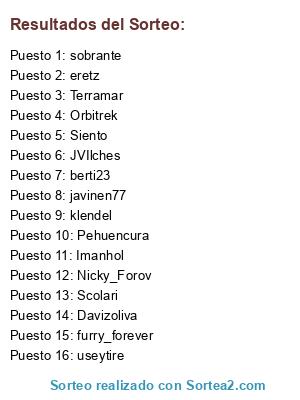 Lista de participantes: Imanhol, javinen77, klendel, Davizoliva, carabelero, furry_forever, Siento, eretz, Orbitrek, Pehuencura, Nicky_Forov, sobrante, Terramar, Scolari, berti23, useytire, JVIlches.