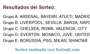 Lista de participantes: ARSENAL, MONACO, ATLETI, BORUSSIA, CHELSEA, EVERTON, BARSA, BAYERN, SHAKTAR, JUVE, LIVERPOOL, CITY, UNITED, MILAN, NAPOLI, PSG, MADRID, ROMA, SEVILLA, VALENCIA.