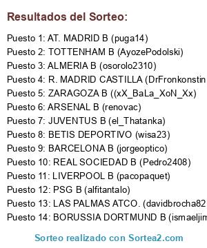 Lista de participantes: AT. MADRID B (puga14), BORUSSIA DORTMUND B (ismaeljimva), BETIS DEPORTIVO (wisa23), R. MADRID CASTILLA (DrFronkonstin), BARCELONA B (jorgeoptico), TOTTENHAM B (AyozePodolski), JUVENTUS B (el_Thatanka), LAS PALMAS ATCO. (davidbrocha82), ALMERIA B (osorolo2310), ARSENAL B (renovac), PSG B (alfitantalo), ZARAGOZA B ((xX_BaLa_XoN_Xx), REAL SOCIEDAD B (Pedro2408), LIVERPOOL B (pacopaquet).