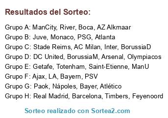 Lista de participantes: Real Madrid, Barcelona, Atlético, Getafe, ManU, ManCity, Totenham, Arsenal, BorussiaD, BorussiaM, Bayern, Bayer, PSG, Monaco, Saint-Etienne, Stade Reims, Inter, Juve, AC Milan, Nápoles, Ajax, Feyenoord, PSV, AZ Alkmaar, Boca, River, Paok, Olympiacos, LA, Atlanta, Timbers, DC United.