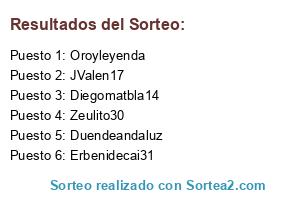 Lista de participantes: Duendeandaluz, Oroyleyenda, Erbenidecai31, JValen17, Diegomatbla14, Zeulito30.