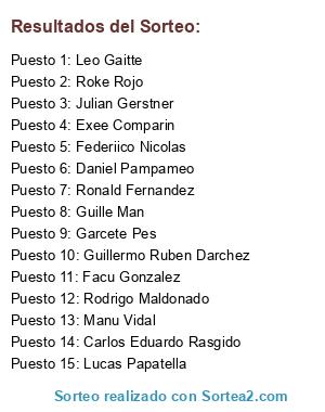 Lista de participantes: Manu Vidal, Leo Gaitte, Julian Gerstner, Guillermo Ruben Darchez, Facu Gonzalez, Exee Comparin, Guille Man, Roke Rojo, Ronald Fernandez, Federiico Nicolas, Lucas Papatella, Daniel Pampameo, Carlos Eduardo Rasgido, Rodrigo Maldonado, Garcete Pes.