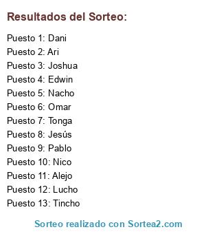 Lista de participantes: Nacho, Ari, Tincho, Tonga, Joshua, Omar, Dani, Edwin, Nico, Lucho, Pablo, Jesús, Alejo.