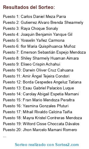 Lista de participantes: Fran Mario Mendoza Peraltra, Rosa Añanca Ruth Pamela, Ludwig Dany Guevara Masias, Shiley Sharmely Huaman Aimara, Flor Nayruth Ccoa Quintana, Borda Cespedes Angeluz Tatiana, Stalin Sanchez Cruz, Nadia Luz Curo Quispe, Amir Ángel Tejeira Condori, Gianella Yadira Huaman Farfan, Emerson Sebastián Espejo Mendoza, Eliseo Crispin Achahui, Wiltord Cisse Choccata Dávalos, Esau Gabriel Palacios Luque, Raya Choque Sonaly, Gutierrez Alvaro Brenda Shearmely, Carolay Abigail Espetia Mamani, Darwin Oliver Cruz Cahuana, Jimmy Abraham Yapura Villa, Yasmina Gonzales Pfuturi, Carlos Enrique Flores Lopa, Yosselin Yañez Carmona, flor Maria Quispihuanca Muñoz, Mihail Rivaldo Calcina Taiña, Jhon Marcelo Mamani Romero, Carlos Daniel Meza Parra, Misshael Antony Chaca Ccapa, Joaquin Benjamin Yanque Gil, Mayra Kristel Contreras Mendoza, Marcelo Ghandi Zamalloa Delgado.