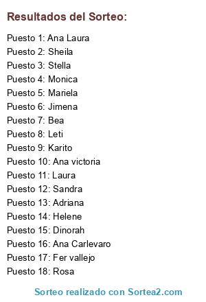 Lista de participantes: Ana Laura , Helene , Sheila , Ana Carlevaro , Fer vallejo , Dinorah , Jimena , Laura , Adriana , Rosa , Mariela , Stella , Monica , Leti , Karito , Sandra , Bea , Ana victoria.